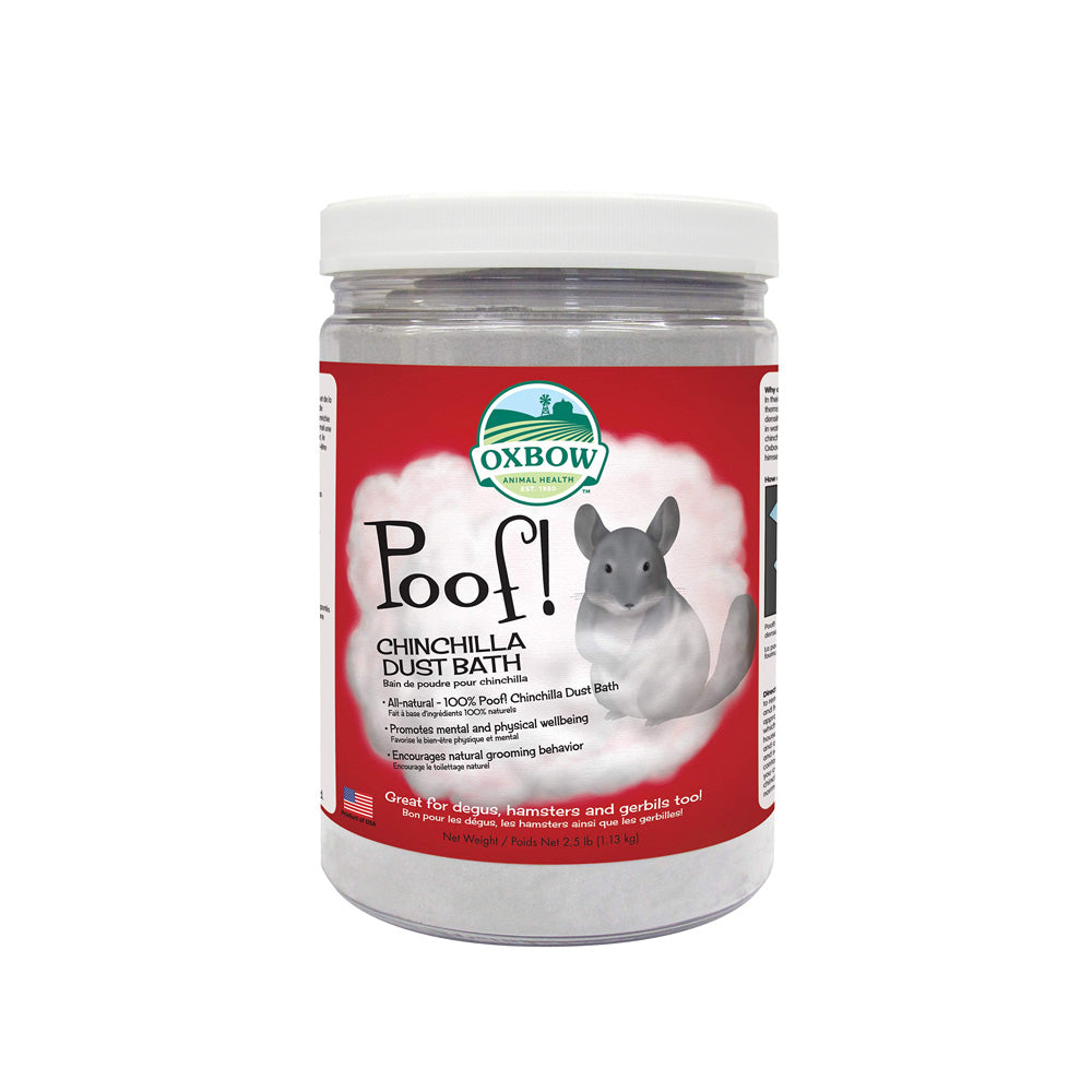 Oxbow Poof è una particolare sabbia da bagno da utilizzare per pulire il pelo del tuo adorato Cincillà. I bagni di polvere con la sabbia Oxbow Poof sono essenziali per il benessere fisico e mentale del tuo piccolo Cincillà.