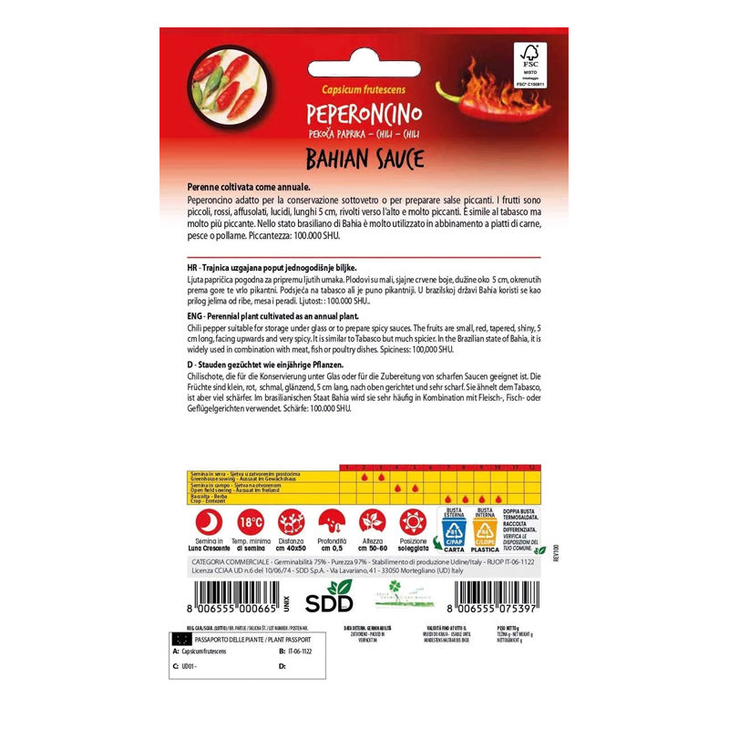 Il Peperoncino Bahian Sauce è una varietà perenne coltivata come annuale. Peperoncino adatto per la conservazione sottovetro o per preparare salse piccanti. I frutti sono piccoli, rossi, affusolati, lucidi, lunghi 5 cm, rivolti verso l’alto e molto piccanti. È simile al Tabasco ma molto più piccante.