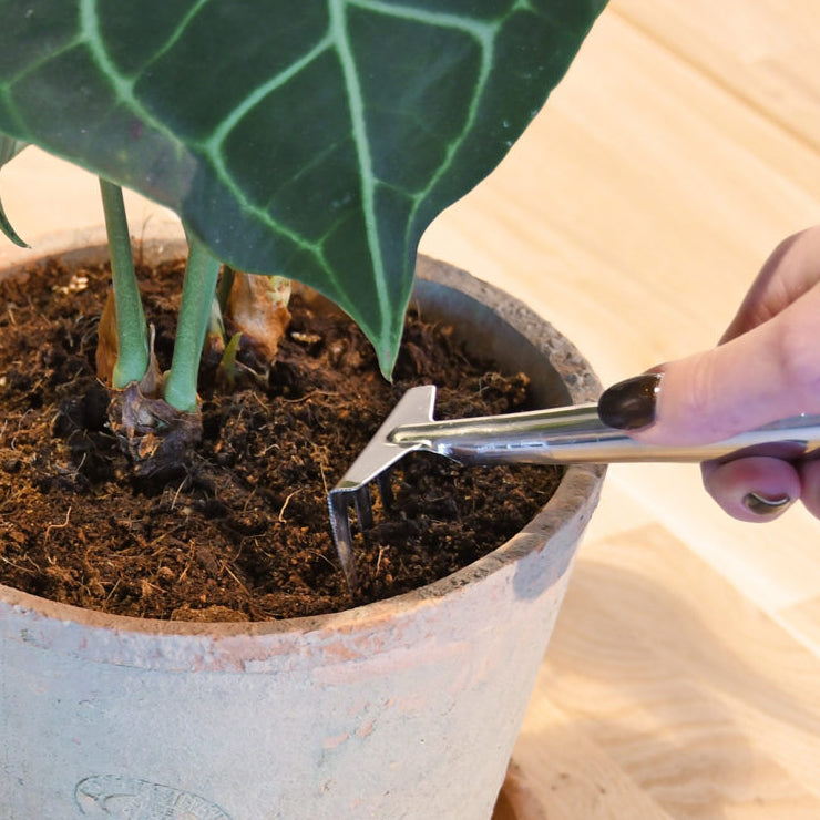 Questo rastrello da giardino per interni è utile per prendersi cura delle piante domestiche. Questo rastrello aiuta ad allentare il terreno prima di aggiungere compost o fertilizzante.