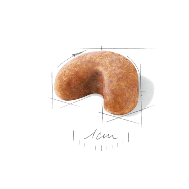 Disegno esclusivo: speciale mascella brachicefala Una crocchetta esclusiva creata per facilitare la prensione ed incoraggiare la masticazione da parte del cucciolo di French Bulldog.