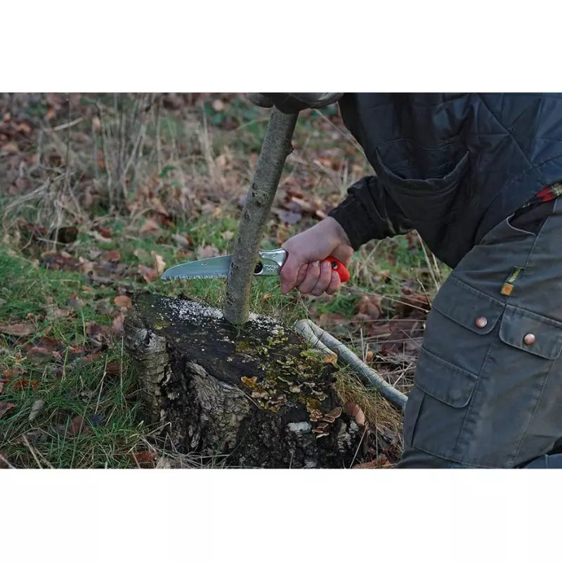 Nel caso non siete soliti tagliare con una sega a mano Silky, fate attenzione ai denti affilati come rasoi che lavorano rapidamente attraverso il legno. Persino dopo un uso frequente, i denti rimangono affilati per molto tempo, così ogni volta che viene lasciato dietro di sé un albero tagliato liscio, questo può ricrescere rapidamente.