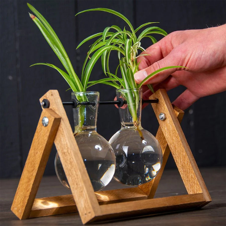 Questo supporto in legno con ampolle di vetro facilita la cura delle talee. Adatto anche come vaso da fiori o per la germinazione dei bulbi.