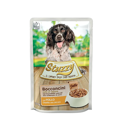 Ingredienti naturali cotti al vapore, in un’irresistibile gelatina. I Bocconcini con Pollo di Stuzzy nutrono il tuo cane con un’alimentazione completa e un alto contenuto di carni.