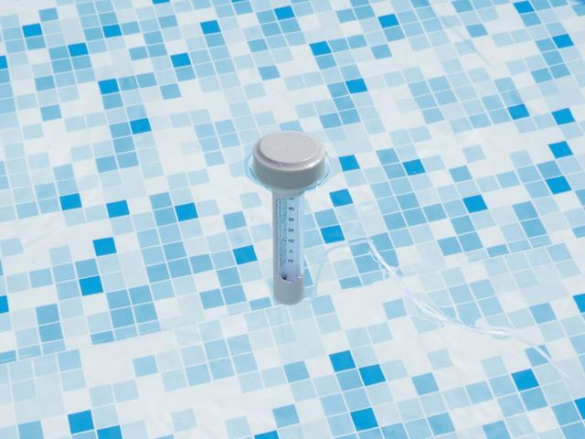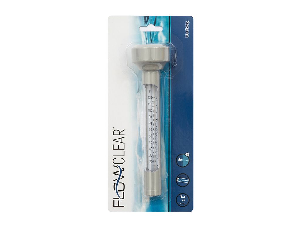 Termometro galleggiante da piscina di facile lettura dotato di una stringa collegata per mantenerlo in posizione. La temperatura è espressa in gradi Fahrenheit e Celsius. Prodotto da Bestway.