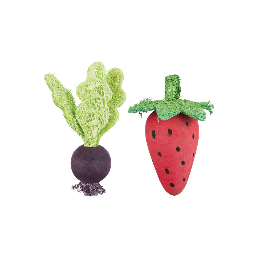 Set di 2 giochini in legno con luffa per favorire l'abrasione dei denti del tuo piccolo roditore. Materiali 100% naturali. Adatto per porcellini d'india, conigli e altri piccoli animali.